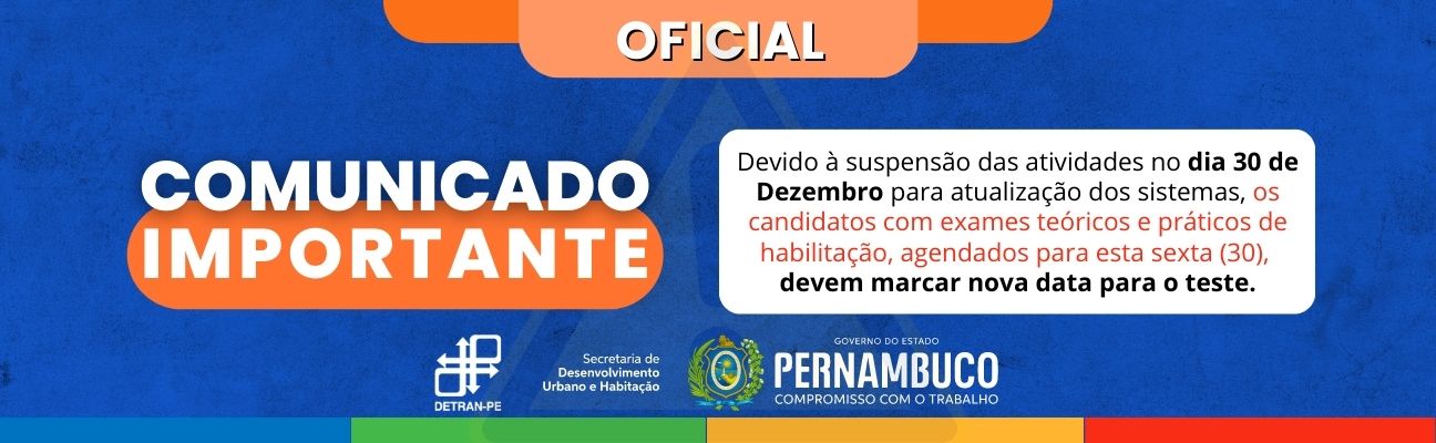 O Departamento Estadual de Trânsito (Detran-PE) esclarece que, devido à suspensão das atividades no dia 30 de dezembro para atualização dos sistemas do órgão, os candidatos com exames teóricos e práticos de habilitação, agendados para esta sexta-feira (dia 30), devem marcar nova data para o teste. O reagendamento pode ser feito por meio das auto escolas ou diretamente no site – www.detran.pe.gov.br, conforme os dias da preferência do candidato. A Diretoria de Operações do Detran-PE esclarece ainda que, além dos dias da semana, novas vagas estão sendo liberadas aos sábados, ampliando a capacidade de atendimento para a população.