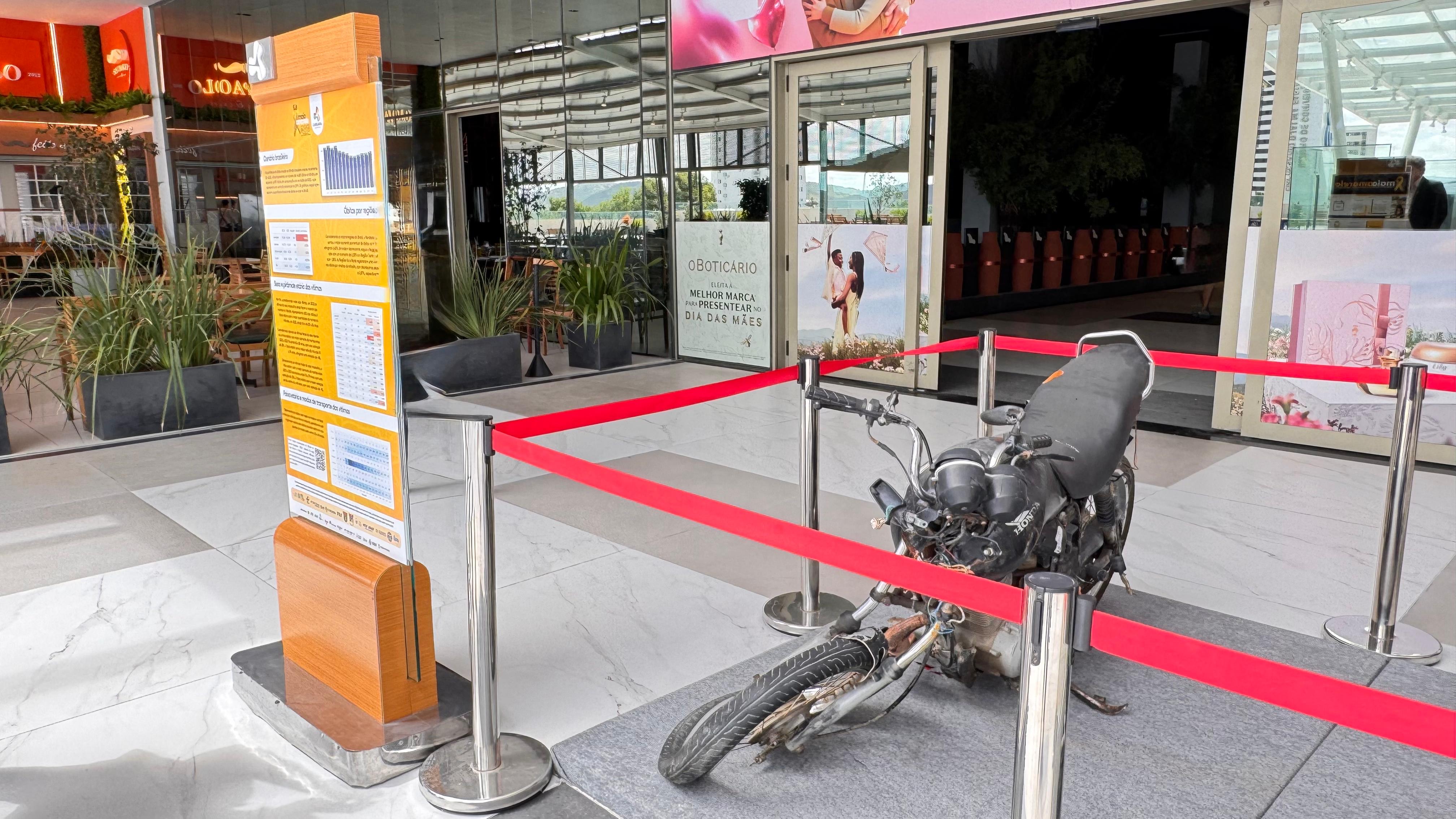 A exposição é de veículos envolvidos em acidentes reais. São quatro carcaças — dois automóveis, posicionados no estacionamento da entrada principal do shopping, e duas motocicletas, localizadas na nova praça de eventos — que ilustram de forma impactante as consequências de condutas imprudentes nas vias. Ao lado de um dos carros expostos estão dados relevantes sobre os sinistros de trânsito no Brasil, estimulando a reflexão sobre a preservação de vidas.