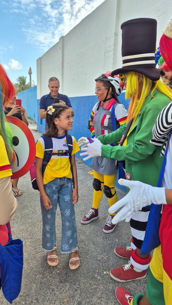 A atividade contou com intervenções pedagógicas da Turma do Fom-Fom, que de forma lúdica reforçou noções de respeito às leis de trânsito, travessia segura e atenção redobrada em áreas escolares. Agentes e educadores do DETRAN-PE também estiveram presentes dialogando com motoristas e responsáveis, destacando a importância da prudência para a preservação de vidas.